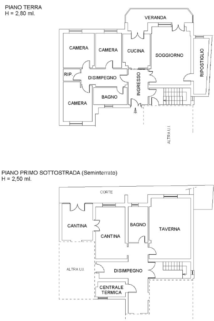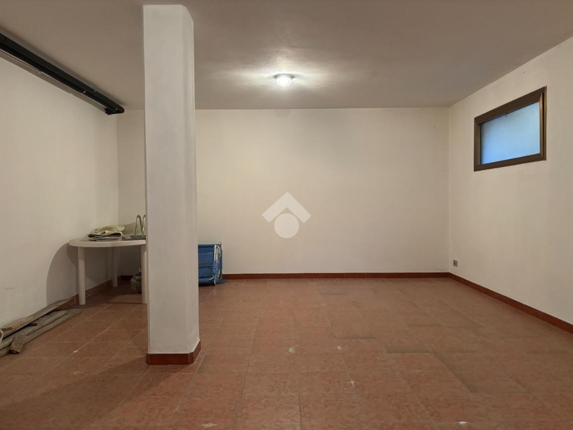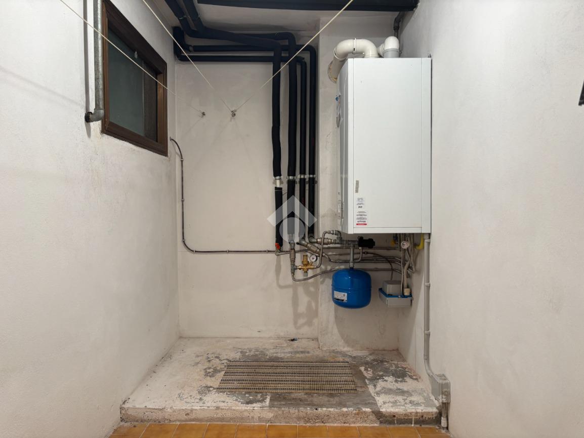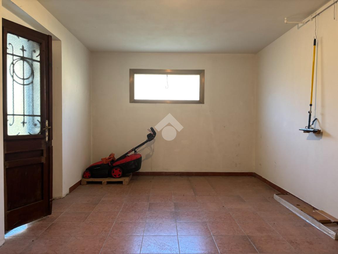 La zona notte è composta da tre camere da letto di dimensioni generose, un ulteriore ripostiglio e un bagno finestrato con doppio box doccia. Al piano seminterrato la proprietà offre una taverna, due cantine e una zona lavanderia dedicate alla porzione più grande, oltre a un garage di 26 mq con accesso diretto all’abitazione.