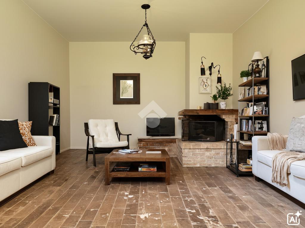 L’abitazione si apre al piano terra con una zona giorno accogliente e ben distribuita: cucina separata, sala da pranzo e soggiorno con un caratteristico caminetto a legna, perfetto per creare atmosfera nei mesi più freddi. Completa il piano un pratico bagno di servizio con doccia.